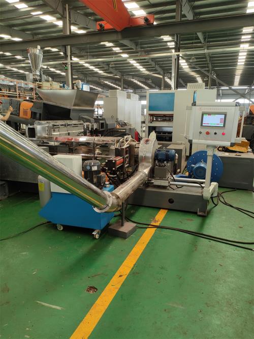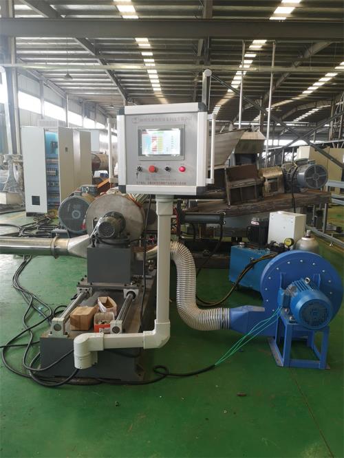 螺桿外表鍍硬鉻處理;2) 螺桿芯部采用通水冷卻4、料筒1)材質為38CrMoALA氮化處理,氮化HV950-1050,深0.6-0.75mm,低煙無鹵造粒機脆性不大于II級;2)螺筒采用水冷卻;筒體上開槽,盤銅管,通冷卻水;螺筒上加防護罩,不銹鋼材質;3) 加熱區(qū)段:采用優(yōu)質鑄鋁加熱器5、水冷卻系統(tǒng)1)水泵泵電機功率:1.5kw;自動控水電磁閥;手動閥用銅閘閥控制;加大水流量,2)采用環(huán)保風冷卻系統(tǒng)(環(huán)保型:發(fā)明專利號:CN201911312134.6)不需要接外循環(huán)水冷卻6、液壓板式換網(wǎng)1)換網(wǎng)器,板式過濾自動換網(wǎng)器,流量截面為圓形;2)液壓缸、液壓站等一套,采用YA-N46抗磨46#液壓油;(油品需客戶自行采購)7、機頭裝置:1) 熱電偶與壓力傳感器分開安裝,分別用于檢測溫度和壓力(七)風冷模面熱切輔機系統(tǒng)1)風冷模面熱切造粒機:4級電機,功率1.5 kw;熱切刀一套、電機聯(lián)軸器一件,采用4把刀片切粒調速控制:采用“三晶或羅賓漢”變頻調速器2)切粒罩:對吹式,不銹鋼材質;一件;床身與切粒罩為整體式;推拉式結構;帶剎車裝置;熱切罩與機頭分離開有足夠空間;操作方便3)一級旋風分離器:φ600mm,不銹鋼材質;一件;采用φ130mm不銹鋼管聯(lián)接;連接方式:5.5kw物料輸送風機;低煙無鹵造粒機4)二級旋風分離器:φ600mm,不銹鋼材質;一件;采用φ130mm不銹鋼管聯(lián)接,4kw物料輸送風機;5)加長振動篩:一臺,L=2.5m,電機采用:震動專用電機;震動量可以調節(jié)大小:電機功率率:0.15KW兩臺;振動篩篩網(wǎng)采用三層分離物料;大孔直徑φ8mm,小孔直徑φ2.5mm,不銹鋼材質,6)三級旋風分離器:φ600mm,不銹鋼材質;一件;采用φ130mm不銹鋼管聯(lián)接;連接方式:5.5kw物料輸送風機;7)風吹成品料倉:一套,1m料倉一件,不銹鋼材質;采用φ130mm不銹鋼管聯(lián)接;4kw物料輸送風機;