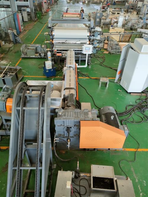 內(nèi)飾隔音片材擠出機(jī)_內(nèi)飾隔音片材擠出機(jī)_佳德裝備110升密煉機(jī)/JDL-150單螺桿片材生產(chǎn)線一、系統(tǒng)機(jī)組技術(shù)參數(shù)Ⅰ、機(jī)器顏色:主機(jī)為:公司標(biāo)色;電柜為:電腦色;防護(hù)罩:黃色Ⅱ、擠出工藝:110升密煉機(jī)-——自動提升機(jī)——錐雙喂料機(jī)——150單螺桿擠出機(jī)——液壓板式換網(wǎng)系統(tǒng)------片材擠出模具-----三輥壓光------三輥冷卻系統(tǒng)-----下覆膜裝置-------托架冷卻----單面電暈------冷卻牽引-----切邊裝置-------計(jì)米器------在線剪板機(jī)------下料平臺-------主機(jī)采用:PLC控制Ⅲ、加工物料:POE汽車內(nèi)飾片材,EVA內(nèi)飾片材 要 求:制品寬度:2000mm 制品厚度:0.8-6mm產(chǎn)